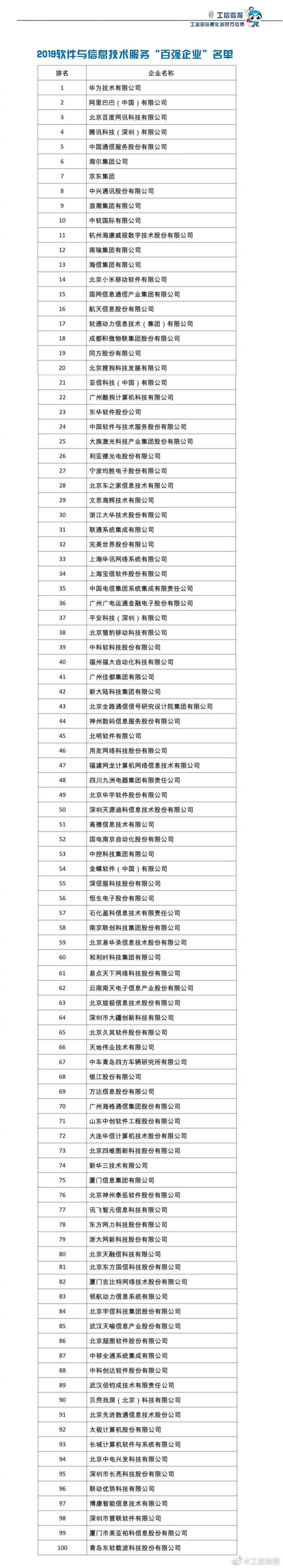 6月28日,2019软件和信息技术服务综合竞争力百强企业发布会暨推动开源软件社区发展高峰论坛,在2019年中国国际软件博览会期间召开。中国电子信息行业联合会在会上揭晓了“2019软件与信息技术服务综合竞争力百强企业”。榜单显示,华为、阿里巴巴、百度分列前三名,腾讯、中国通信服务、海尔、京东、中兴通讯、浪潮、中软国际进入前十。